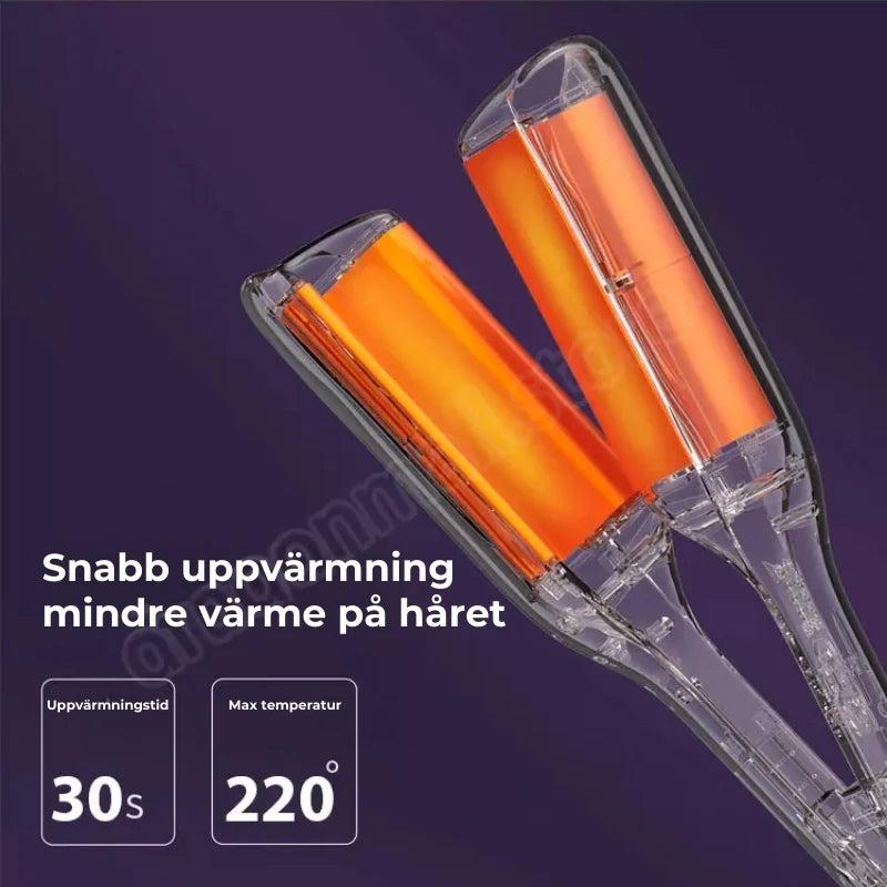 - Den unika 32mm vågformen ger naturliga, fylliga vågor som håller hela dagen – med perfekt glans och volym.